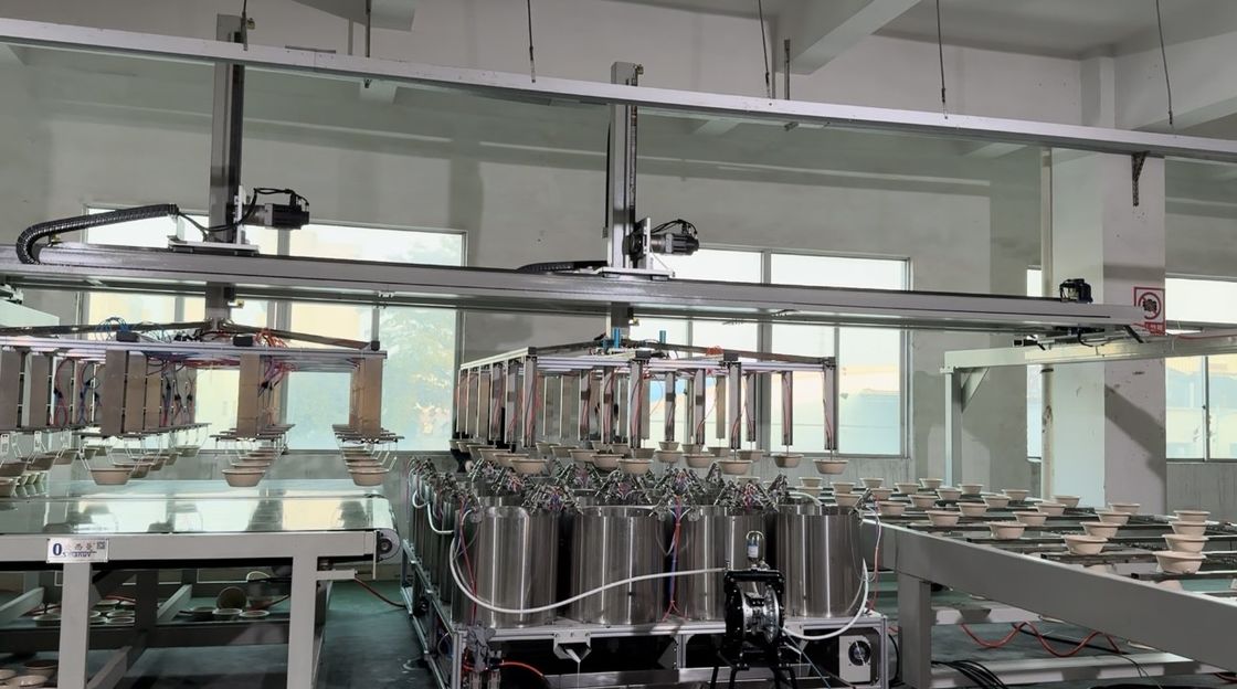 This fully automated 24-station spin coating line is specifically engineered for applying uniform, waterproof coatings to pulp molded tableware such as plates, bowls, and food containers. The system integrates a double-station gantry robot for high-speed loading/unloading, 24 precision spin coating devices for consistent 360-degree coverage, and a 24-meter IR drying tunnel for rapid curing. This complete line ensures a high-quality, food-safe barrier that enhances product durability and liquid resistance.